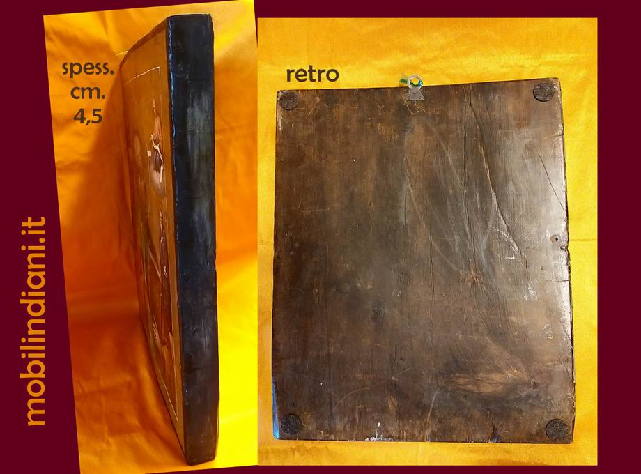 Disponibilità 1Icona antica religiosa dipinta su legno. Provenienza area dei Balcani. Cm.50,5x41,5 spess.4,5 Restaurata. Figura principale San Nicola. In alto: sinistra Gesù e la Madonna. In basso: Figura di donna che simboleggia la passione e San Giovanni. PER INFO COSTI SPEDIZIONE CHIEDI su WhatsApp o via mail: info@mobilindiani.it