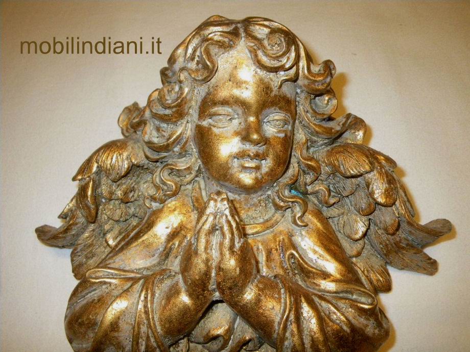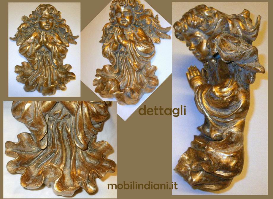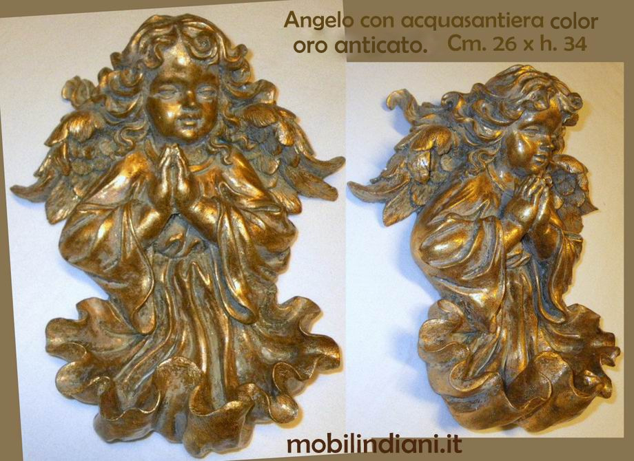 Acquasantiera da parete a forma di Putto, realizzata in resina colore oro anticato. Da notare la vaschetta sporgente alla base del Putto (vedi foto) Cm.26 h.34 Paese India COSTO TRASPORTO €. 8,80 Iva Inclusa. Per costi trasporto Isole, chiedi info su WhatsApp o mail: info@mobilindiani.it