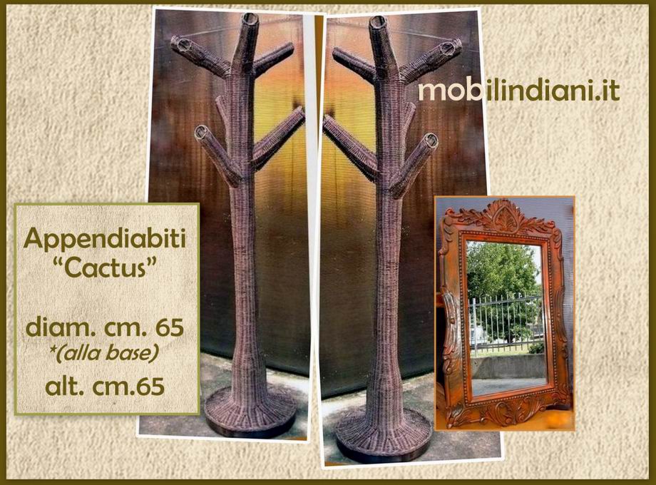 Disponibilità 1Attaccapanni Cactus, struttura in ferro, base e pernio centrale in legno, il tutto rivestito in rattan. Robusto per appendere cappotti, montoni, giubbotti ecc. Ingombro max. diametro cm.65 (alla base) h.210 Indonesia RITIRO PRESSO NS. SEDE COSTO ZERO. Per info chiedi su WhatsApp o mail: info@mobilindiani.it