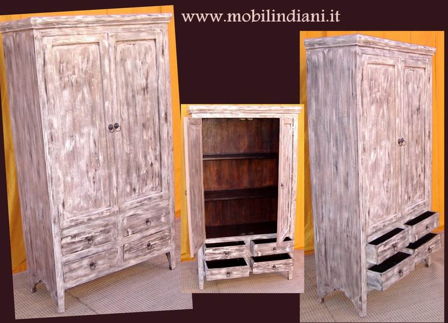 Disponibilità 1Armadio indiano in legno decapato, finitura chiara. 2 ante e 4 cassetti, con ripiani interni. (vedi foto) Ideale per la tua seconda casa. Cm. 100x40 h.181 Origine India. Legno decapato sheesham (noce) PER COSTI SPEDIZIONE CHIEDI su WhatsApp o via mail: info@mobilindiani.it