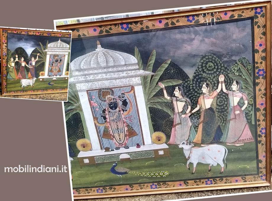 L'immagine raffigura Shrinathji, una forma del Dio Krishna, all'interno di un santuario. Il tempio principale di Shrinathji si trova a Nathdwara, in Rajasthan, India. La divinità è raffigurata con la mano sinistra alzata a simboleggiare il sollevamento del monte Govardhan e la mano destra è poggiata sul fianco. L'immagine di Shrinathji è realizzata da un'unica lastra di marmo nero e si ritiene che si sia manifestata da sola. Ai lati del santuario, sono presenti della figure femminili; Le Gopi, tre per lato, in posa di adorazione. Il nome "Gopi" ha origini sanscrite, significa letteralmente "pastore di mucche" o "compagna di giochi di Krishna" Mis. cm.142,5 h.89 spess.4 Pronto da appendere. SOLO RITIRO PRESSO NS. SEDE COSTO ZERO. Info su WhatsApp o mail: info@mobilindiani.it