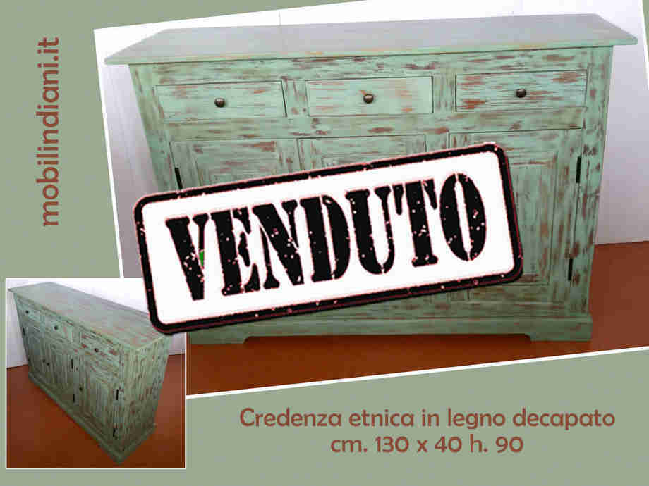 Disponibilità 0Credenza indiana legno decapato colore salvia, 3/cassetti + 3/ante. Legno massello sheesham (noce) Cm.130x40 h.90 Paese India