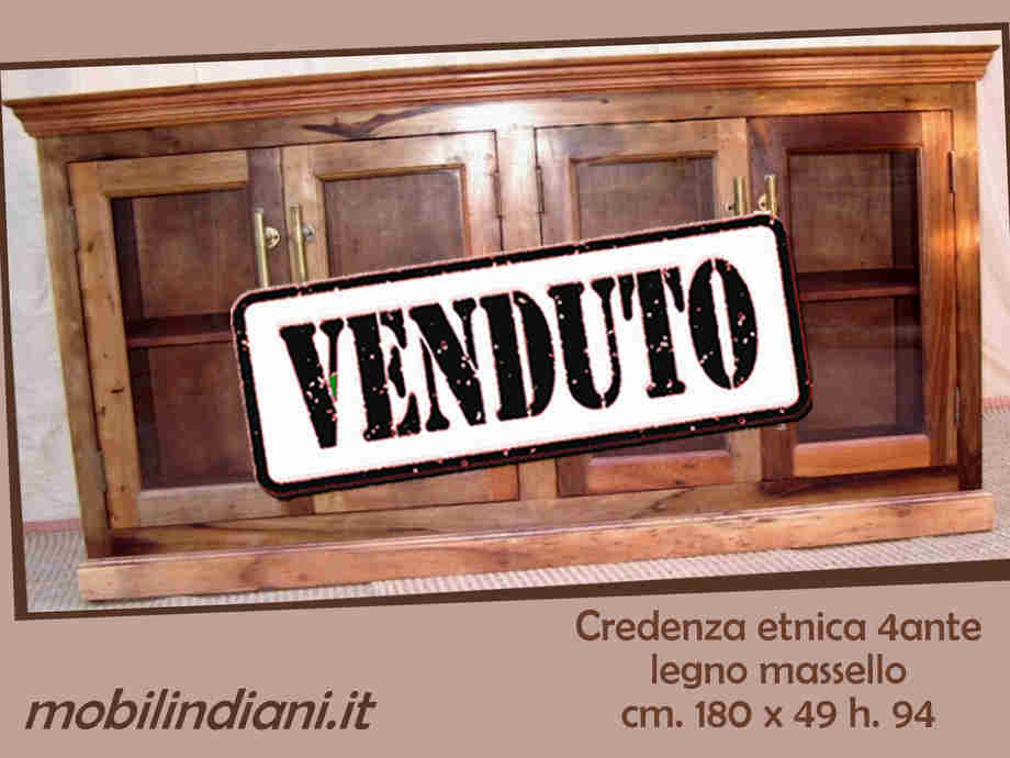 Disponibilità 0Credenza etnica con ante a vetro. Particolare e originali le maniglie in ottone presenti sulle quattro ante. Cm.180x49 h.94 Legno massello sheesham (noce) India