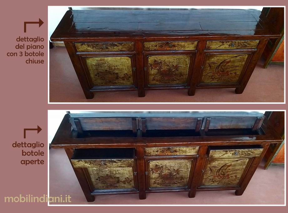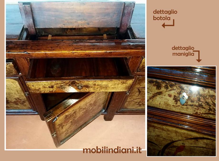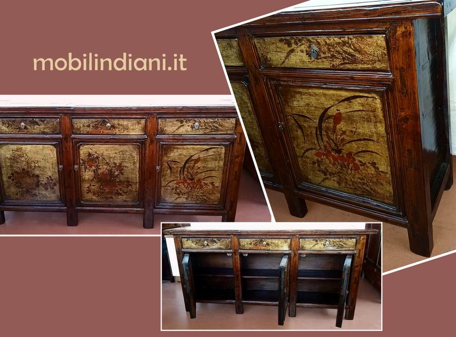 Disponibilità 1Mobile della Mongolia antico, laccato e originale. 3/cass.+3/ante molto capiente. Si accede ai cassetti in due modi: classico, aprendo il cassetto, oppure tramite i 3 sportelli presenti sul piano, dette botole (vedi foto) Mis. cm.213x48,5 h.98,5 Legno massello. ***SPESSORE DEL PIANO CM.5*** La caratteristica dei mobili mongoli, era quella di decorare la facciata frontale. PER INFO COSTI SPEDIZIONE CHIEDI su WhatsApp o via mail: info@mobilindiani.it