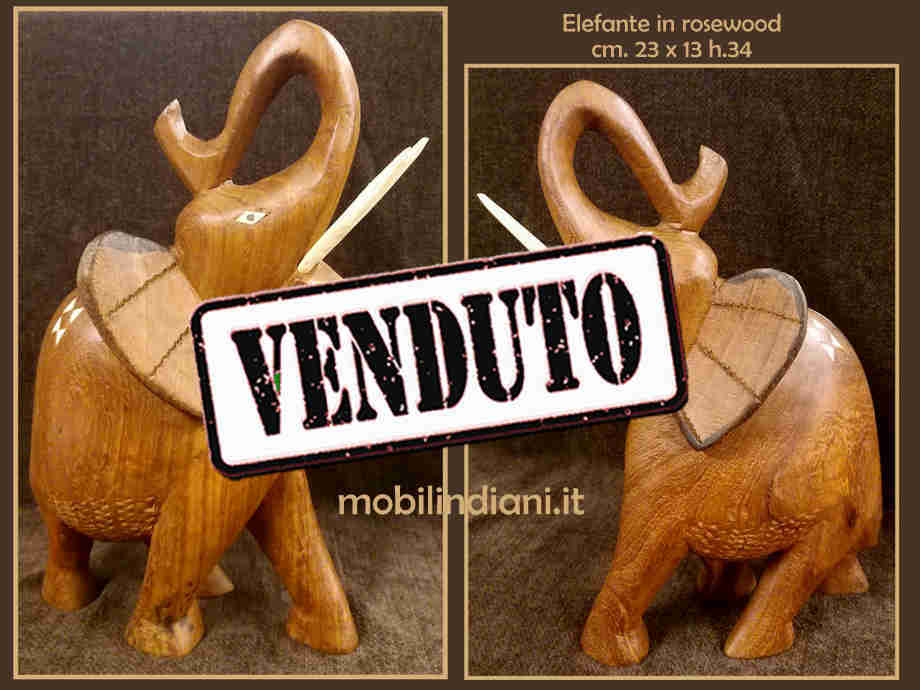Disponibilità 0Elefante indiano in legno di rosewood intagliato a mano. Zanne in legno. Paese di proveniente Rajasthan, India. Misure cm.23x13 h.34