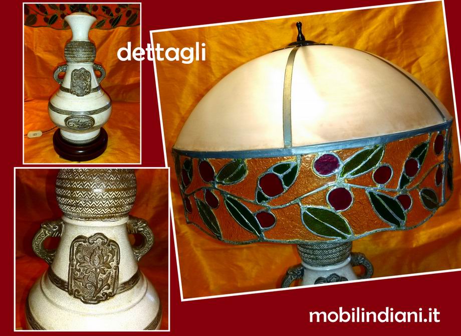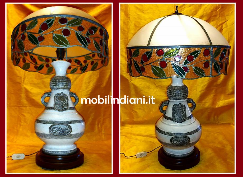 Disponibilità 1Antica lampada da tavolo, epoca fine '800 inizi '900. Kit elettrico originale in perfette condizioni. Paralume in vetro opale con fascia lavorata (stile tiffany) Lampada in maiolica fissata su base in legno. Diam. cm.43 - alt.73 Paese Italia RITIRO PRESSO NS. SEDE COSTO ZERO. Per info chiedi su WhatsApp o mail: info@mobilindiani.it