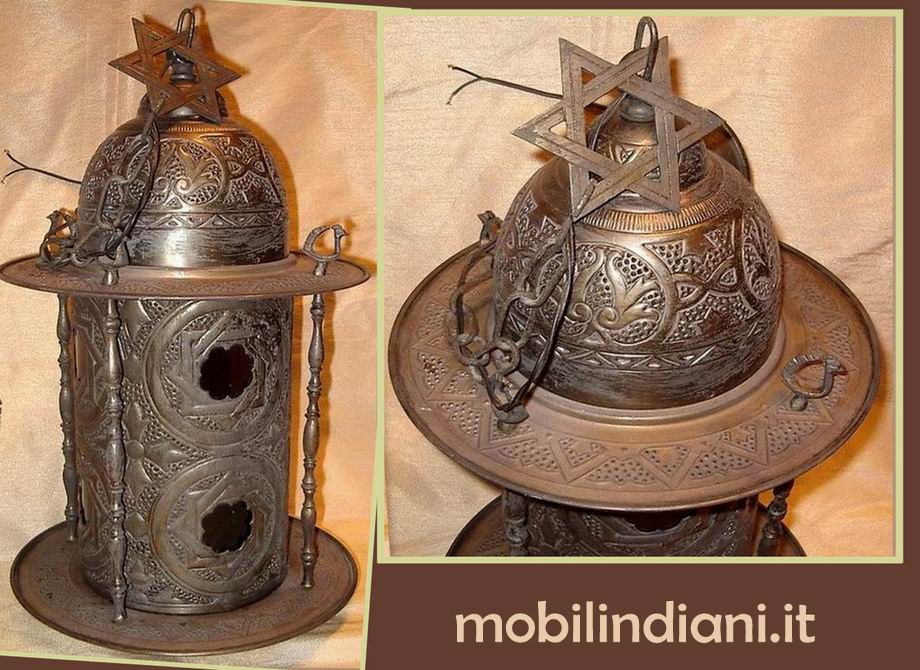 Disponibilità 1Lampadario etnico in bronzo cesellato. La luce fuoriesce dal basso e dai vetri colorati presenti sul cilindro. Periodo anni '30 Diam. cm.27 h.50 + catena in bronzo lunga cm.50 COSTO TRASPORTO €. 19,95 Iva Inclusa. Per costi trasporto Isole, chiedi info su WhatsApp o mail: info@mobilindiani.it