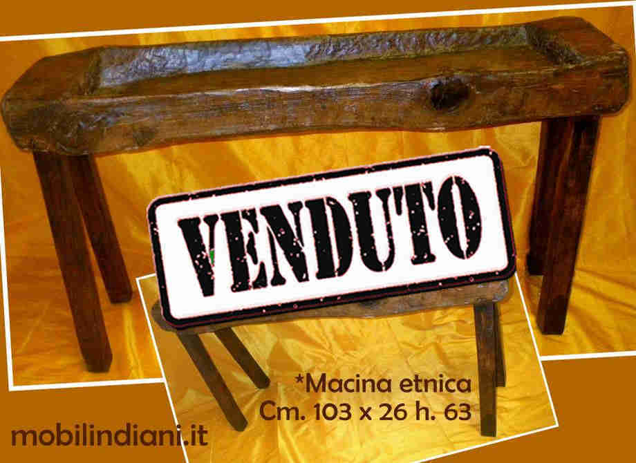 Disponibilità 0Particolare complemento d'arredo etnico. Mangiatoia indiana in teak riciclato scavato a mano. Cm.103x26 h.63 Paese Rajasthan, India.