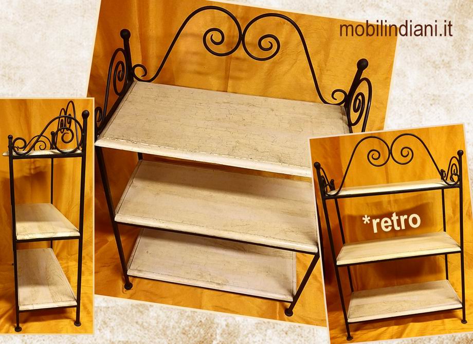 Etagère 3/ripiani in legno, finitura crackle color avorio. Struttura in ferro battuto pieno. Cm.64x32 h.100 Paese India COSTO TRASPORTO €. 35,38 Iva Inclusa. Per costi trasporto Isole, chiedi info su WhatsApp o mail: info@mobilindiani.it