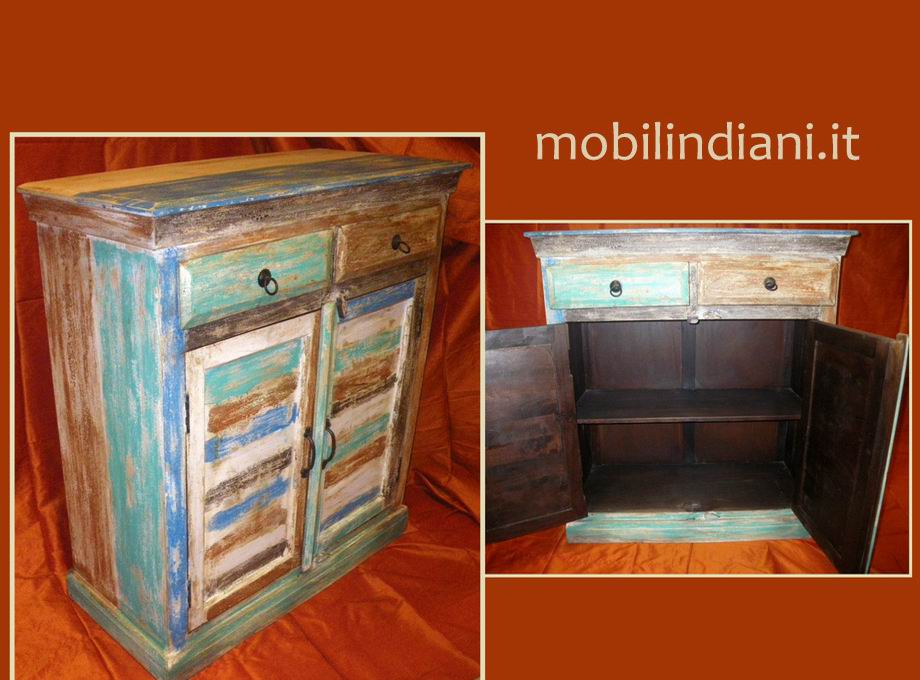 Credenza etnica stile vintage, legno teak riciclato, finitura decapè. Cm.89x41 h.101 Paese Rajasthan, India. L'arredamento vintage è frutto di creatività, personalizza gli ambienti delle ns. case per uno spazio fuori dalle regole in stile "total vintage" PER INFO COSTI SPEDIZIONE CHIEDI su WhatsApp o via mail: info@mobilindiani.it