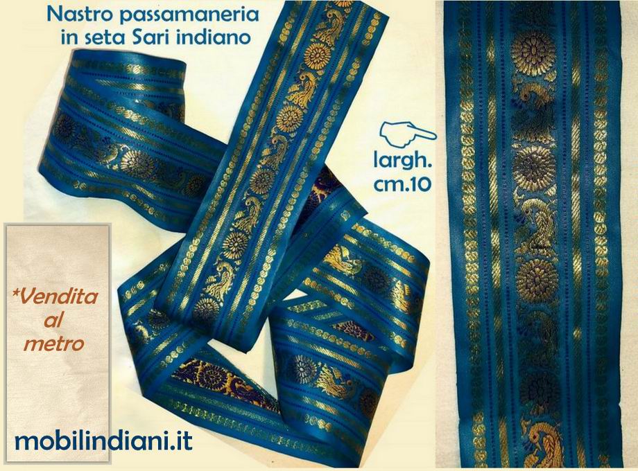 Disponibilità 50Nastro in broccato di seta Sari, base blu finemente ricamato con filato color oro. Decori jacquard tipici della zona dell'India. Altezza cm.10 Vendita a metro €. 5,50/mt. *Acquisto mim. 3/mt. Indicare nelle note dell'ordine i metri desiderati. Per info chiedi su WhatsApp o mail: info@mobilindiani.it
