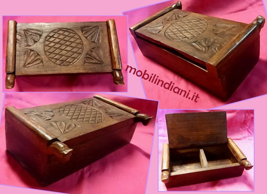 Disponibilità 1Scatola orientale in palissandro intagliato a mano con divisorio interno. Ideale per contenere caramelle, frutta secca o altro... a propria fantasia. Cm.31x19 h.11 Paese Rajasthan, India. COSTO TRASPORTO €. 12,81 iva inclusa.
