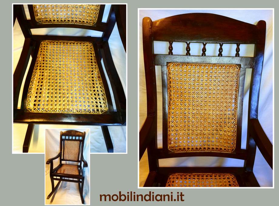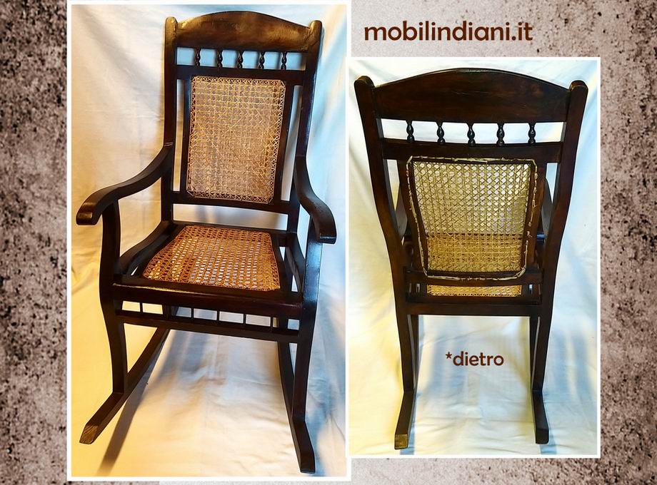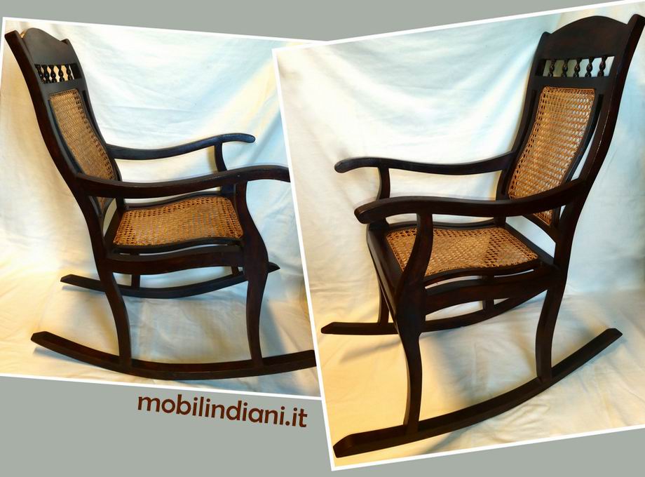 Disponibilità 1Sedia dondolo etnica, realizzata in legno esotico mogano massello, seduta e schienale in midollino, materiale resistente e flessibile. Prodotto artigianale. Mis. ingombro max. cm.90x56 h.95 RITIRO PRESSO NS. SEDE COSTO ZERO. Per info chiedi su WhatsApp o mail: info@mobilindiani.it