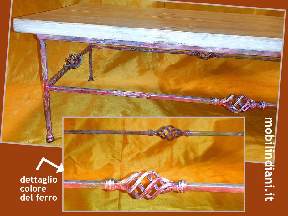 Tavolino artigianale con piano in legno massello decapato e base in ferro forgiato a mano. Cm.120x57 h.38 Paese Italia PER INFO COSTI SPEDIZIONE CHIEDI su WhatsApp o via mail: info@mobilindiani.it