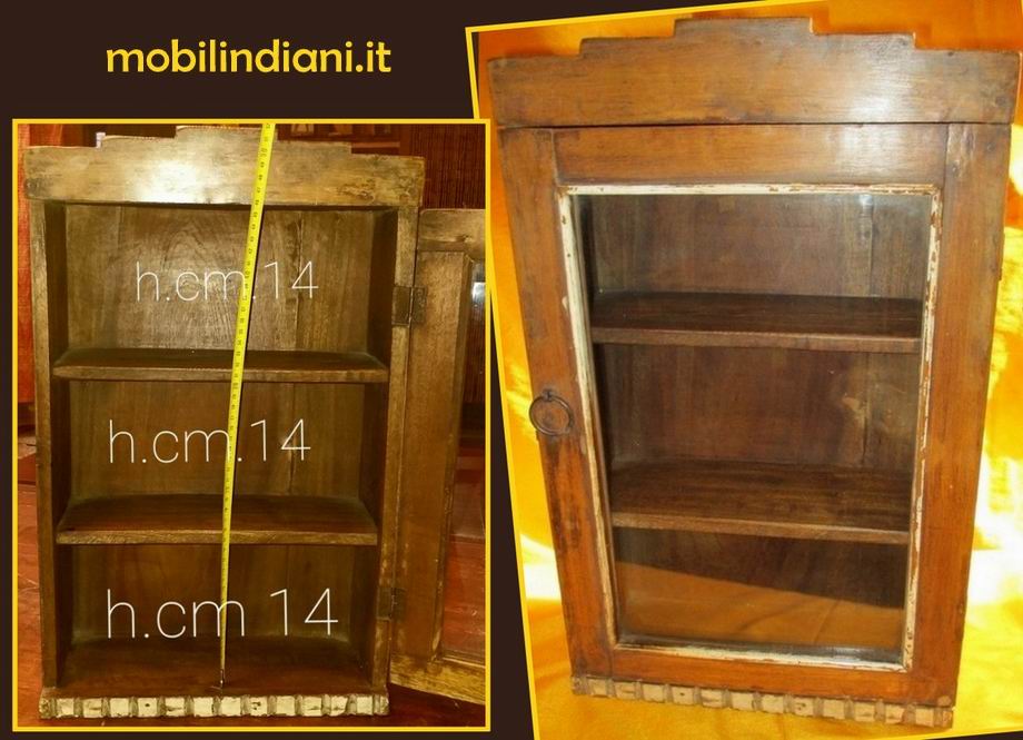 Disponibilità 1Vetrinetta pensile in teak vecchio con mensole interne. Completa di ganci per appenderla a parete. Cm.32,5x13,5 h.54 Paese India. Le misure riportate, si riferiscono ai punti di massima sporgenza. COSTO TRASPORTO €. 35,38 iva inclusa. Per trasporto Isole invia mail a info@mobilindiani.it